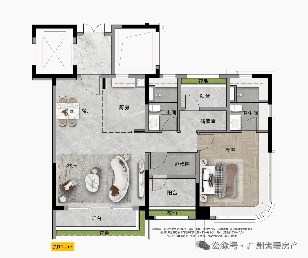 2号楼为两梯三户,分别有三种户型,108/110方做三房,120可做四房。3栋(3A/3B)则是140方可做四房户型,板楼设计,两梯两户,是楼盘的主打户型,货量最多。